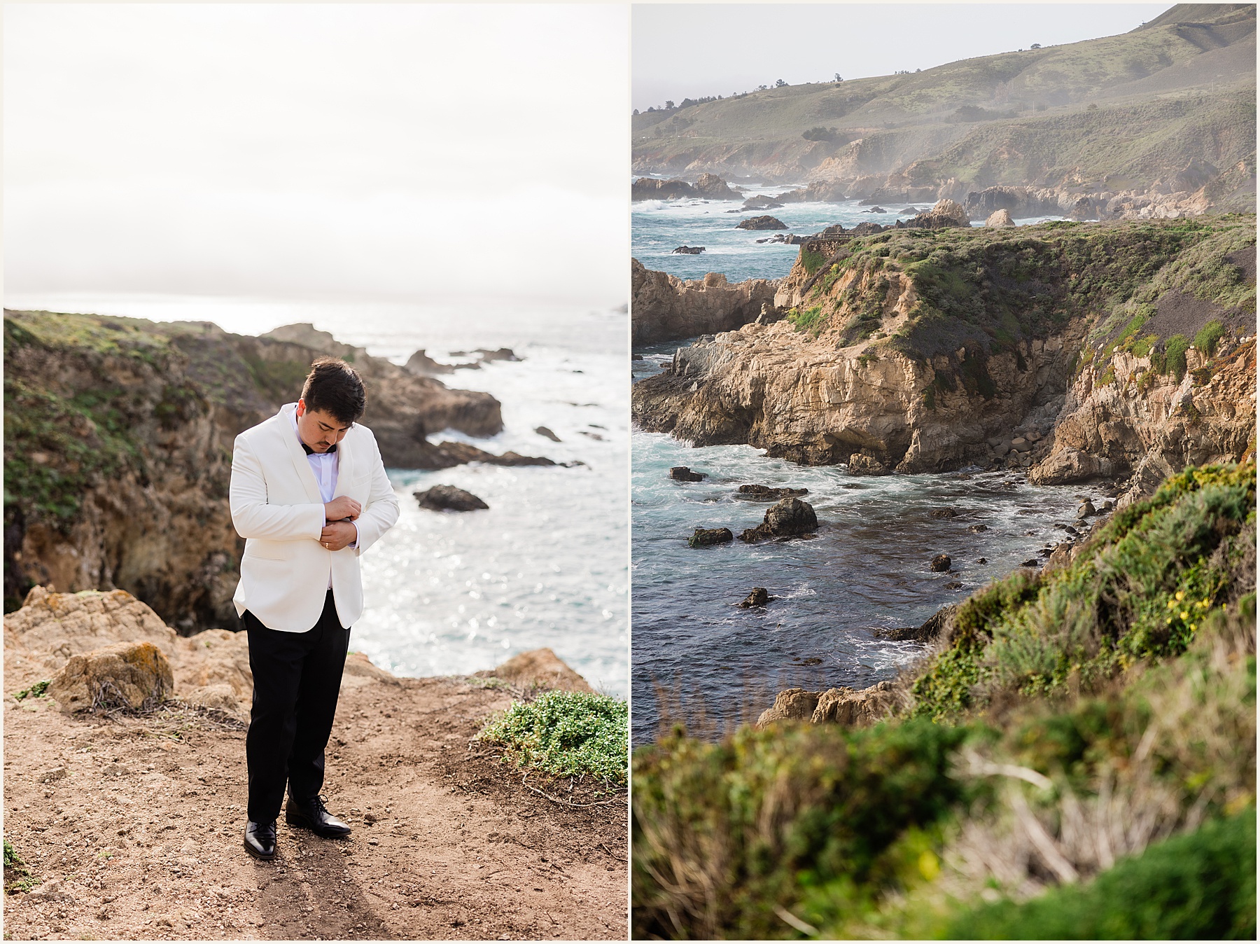 We began the day at the Tickle Pink Inn in the Carmel Highlands, where Patricia and Salomon had a gorgeous corner room overlooking the ocean. The peaceful sound of waves set the tone as they got ready togetherβsuch a sweet and grounding way to start the day. Patricia hired a professional hair and makeup artist to help her get ready, and the vibe was all smiles and excitement.