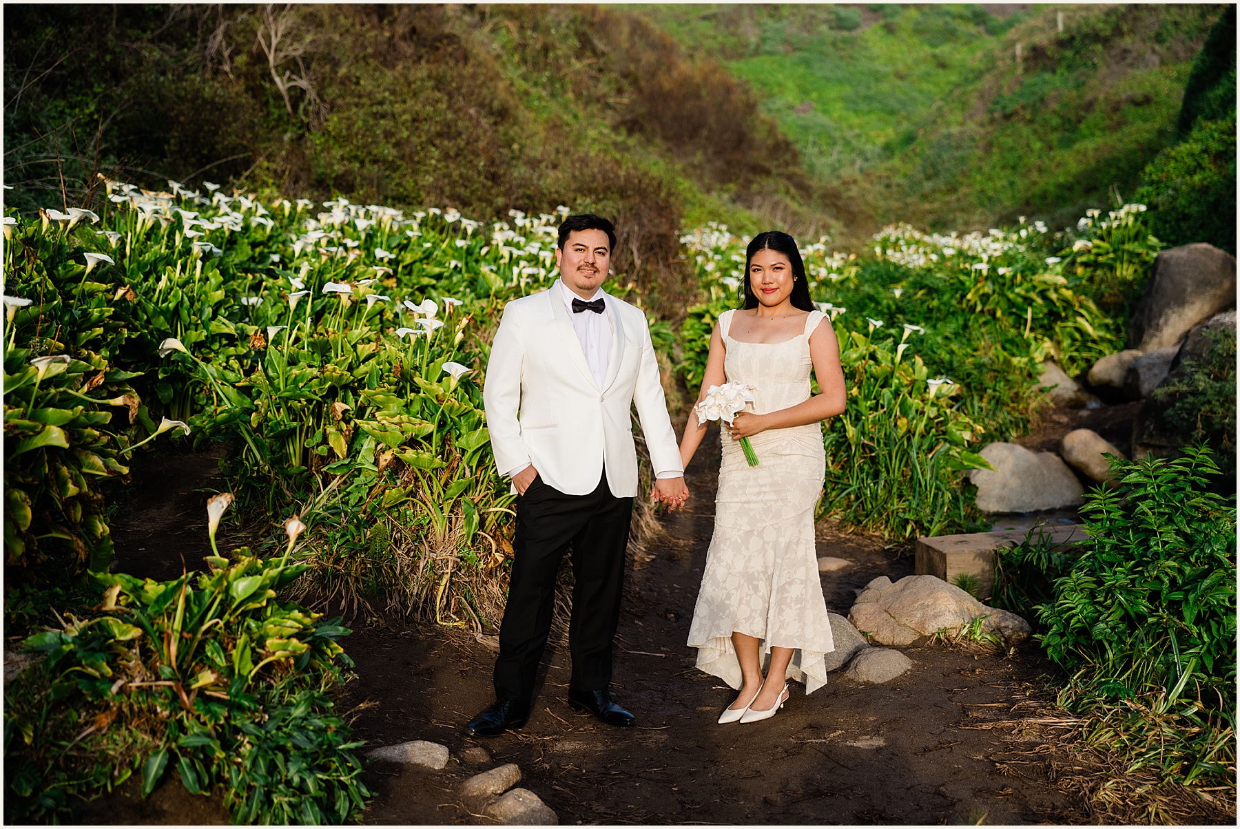 For their sunset session, we met up at Garrapata State Park, one of the most breathtaking spots on the Big Sur coast. Patricia and Salomon had carefully planned their visit to Calla Lily Valley during peak bloomβand it was magical. Towering calla lilies surrounded us in this hidden, flower-filled valley right next to the beach.